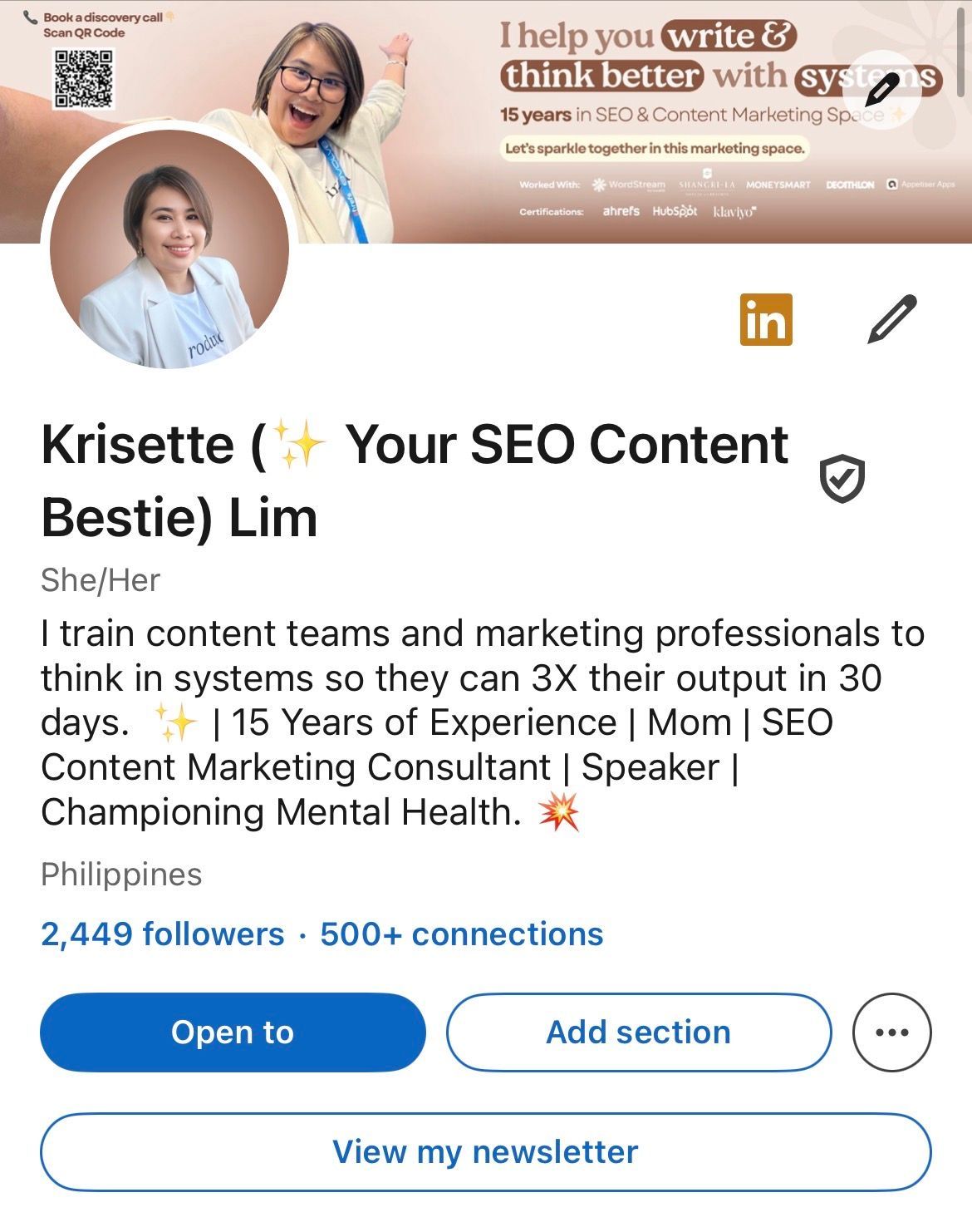 I have been working with Krisette since around 2015 or 2016, and she is always my No. 1 choice for high-quality content writing. Krisette always delivers high-quality work on time, whether it’s a blog post or website content. Most importantly, Krisette provides me valuable insights into online marketing and SEO, helping me gain a deep understanding of how online marketing works. Krisette always stays up-to-date with the latest online marketing changes, especially in the age of AI, she learns the changes and effectively implements them into my projects. I would highly recommend working with Krisette.